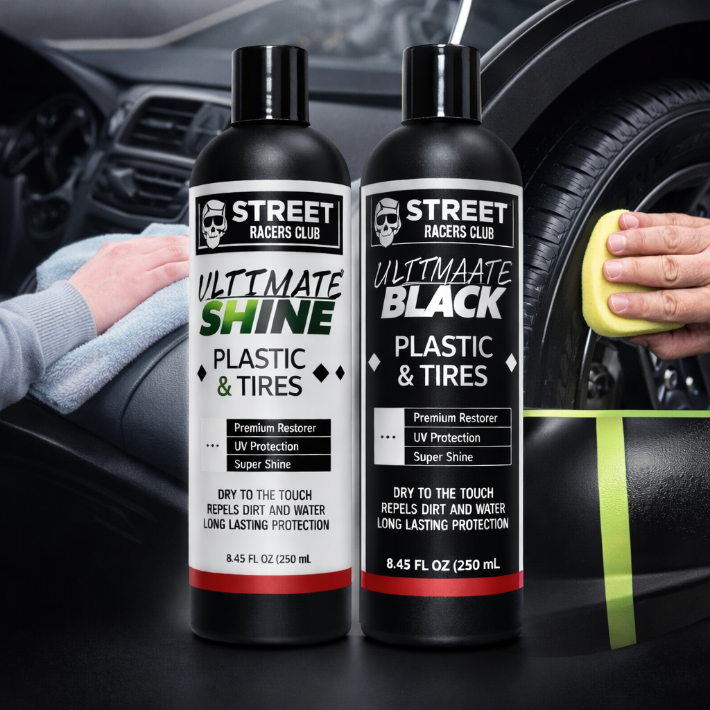 Combo automotriz con ULTIMATE BLACK y ULTIMATE SHINE (250 mL c/u) para restaurar plásticos exteriores y renovar el brillo interior del vehículo.